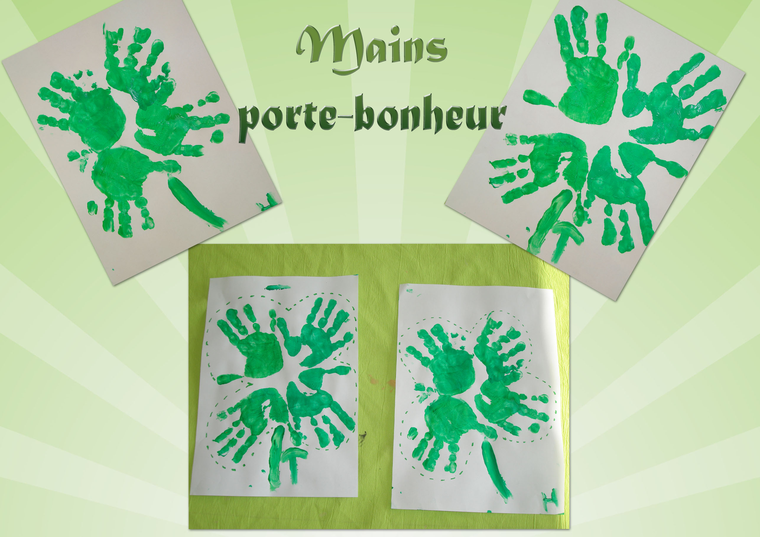 Bien sûr c'est de la peinture verte aux doigts. On badigeonne les mains et on pose 4 fois les mains sur la feuilles. On trace une tige avec le doigt et maman trace le contour en pointillés au feutre vert !